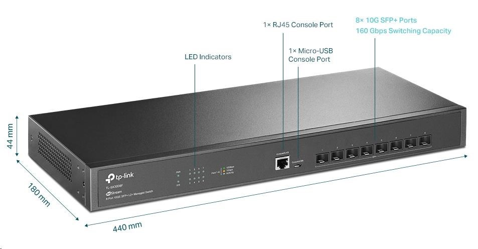 - Bleskurychlá připojení 10G: 8 portů SFP+ s rychlostí 10 Gbit/s poskytuje vysoce propustné širokopásmové připojení a přepínací kapacitu 160 Gbit/s bez blokování.