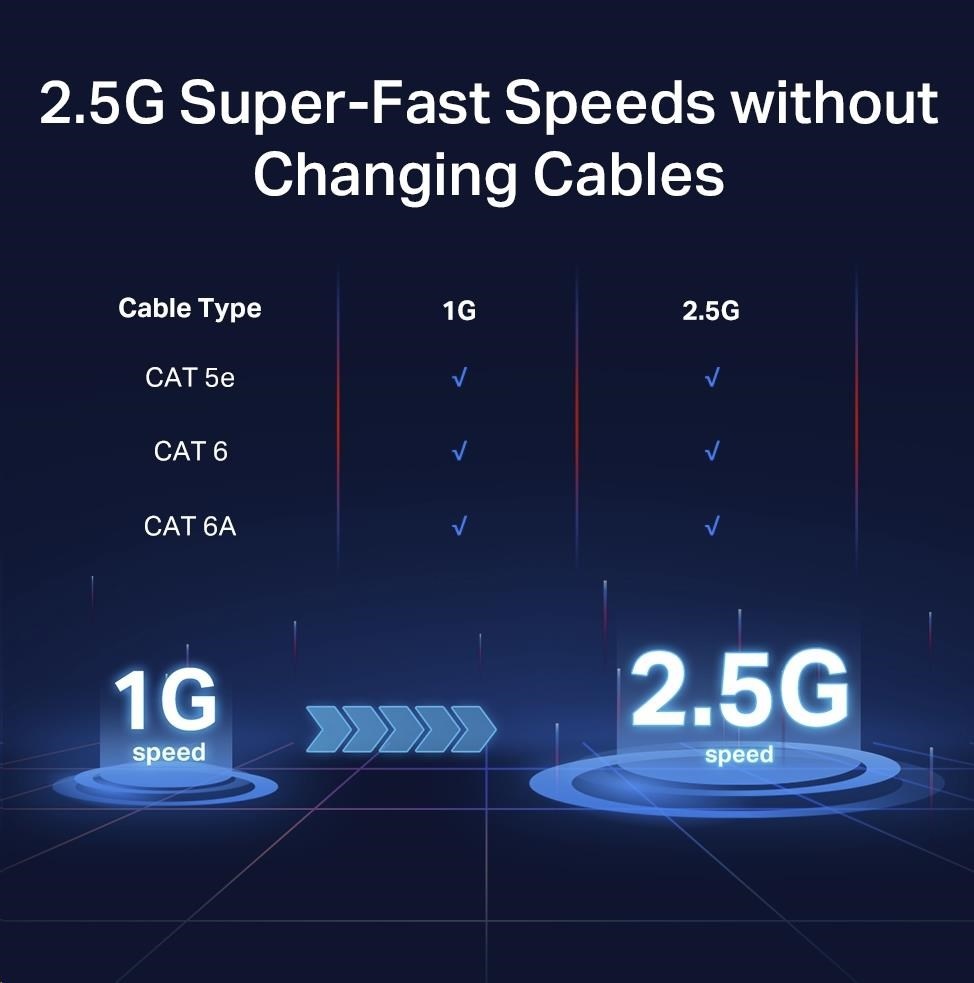 - Bezproblémové použití kabelů - Okamžitě zvyšte rychlost sítě na 2,5 Gbit/s bez nutnosti výměny kabelů za kabely standardu Cat6, čímž si ušetříte peníze i námahu.
