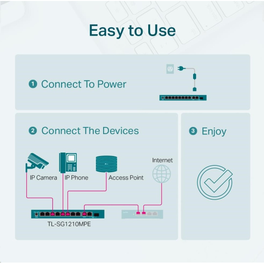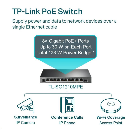 TL-SG1210MPE je plně kompatibilní se zařízeními PoE, jako jsou IP kamery, přístupové body a IP telefony. Lze také použít pro kabelové připojení zařízení bez PoE, jako jsou počítače, tiskárny a IPTV.