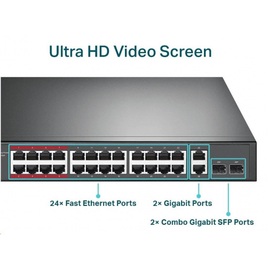 - 24 portů RJ45 PoE + 10/100Mb/s, 2 gigabitové porty RJ45 a 2 kombinované gigabitové SFP sloty