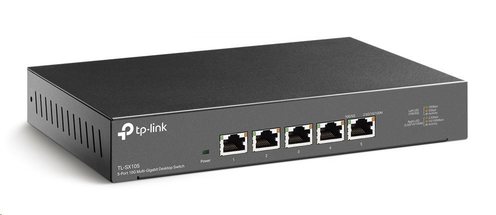 Switch TL-SX105, který je vlajkovým produktem segmentu 10G, je 5portový stolní switch 10G s kapacitou přepínání až 100 Gbit/s. Funkce automatického vyjednávání rychlostí 5rychlostního připojení (100 Mbit/s / 1G / 2.5G / 5G / 10G) monitoruje rychlost připojení a inteligentně ji přizpůsobuje pro kompatibilitu a optimální výkon všech vašich zařízení, včetně úložišť NAS 10G, serverů 10G, pracovních stanic, herních počítačů, přístupových bodů 2.5G / 5G / 10G WiFi 6, 8K videí, stolních počítačů a dalších aplikací.