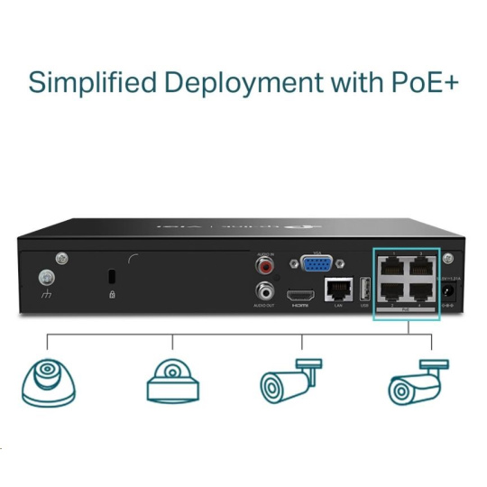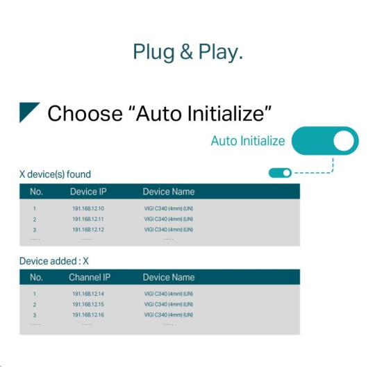 - Plug & Play - Umožňuje automatické přidávání nových a nepoužitých IP kamer VIGI do nového NVR a okamžitou aktivaci, takže instalace je rychlejší než kdykoli předtím.