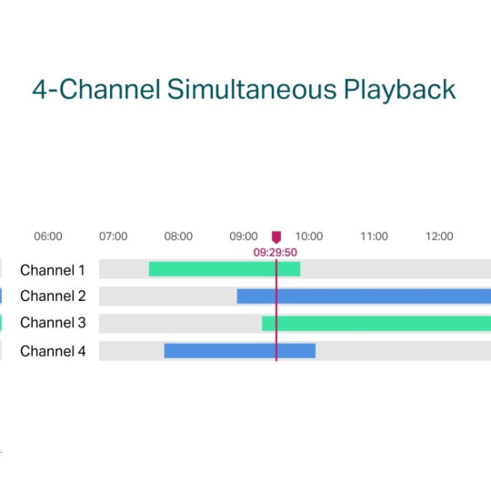 - 4-kanálové simultánní přehrávání - Přehrávejte záznam až ze 4 kamer současně, zvyšte rychlost přehrávání a vyhledejte události v plánu videa, abyste si mohli snadno prohlédnout záznam.