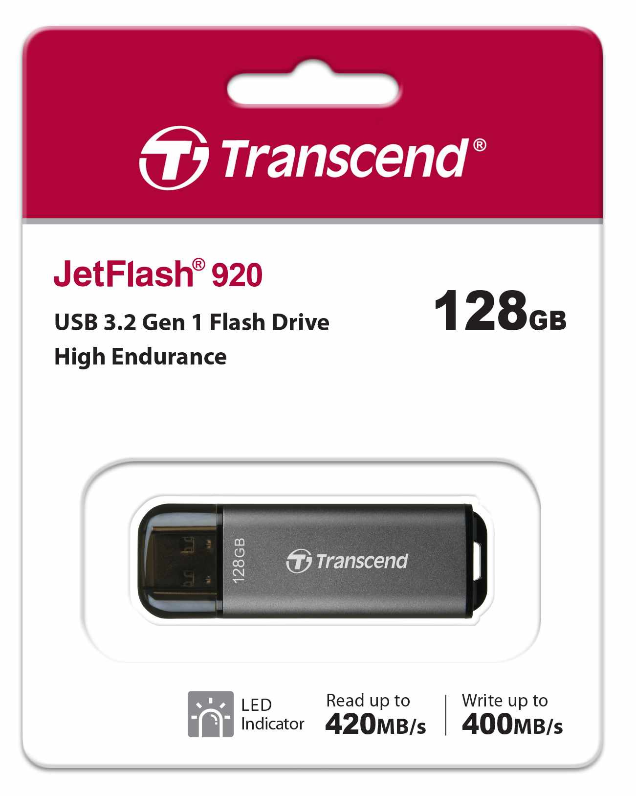 Introducing Transcend's high endurance, high performance JetFlash 920, a USB flash drive that is anything but ordinary. Boasting sensational read speeds of up to 420MB/s and write speeds of up to 400MB/s, the JetFlash 920 delivers top-notch performance in a sleek and portable design. Its aluminum metallic housing will safeguard your data wherever you go.