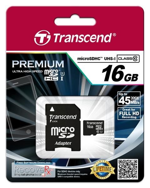 TRANSCEND MicroSDHC karta 16GB Premium, Class 10 UHS-I 300x + adaptér