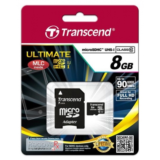 TRANSCEND MicroSDHC karta 8GB Ultimate, Class 10 UHS-I 600x, MLC + adaptér