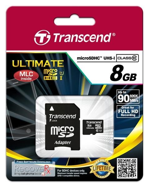 TRANSCEND MicroSDHC karta 8GB Ultimate, Class 10 UHS-I 600x, MLC + adaptér