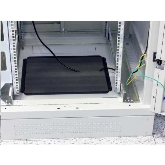 Kabelová průchodka šedá s molitanovou výplní. Je určena do montážních otvorů pro ventilační jednotky, stojanových rozvaděčů Tritón nebo přímo do zdvojených podlah datových center, po vyříznutí montážního otvoru 350 x 420 mm..