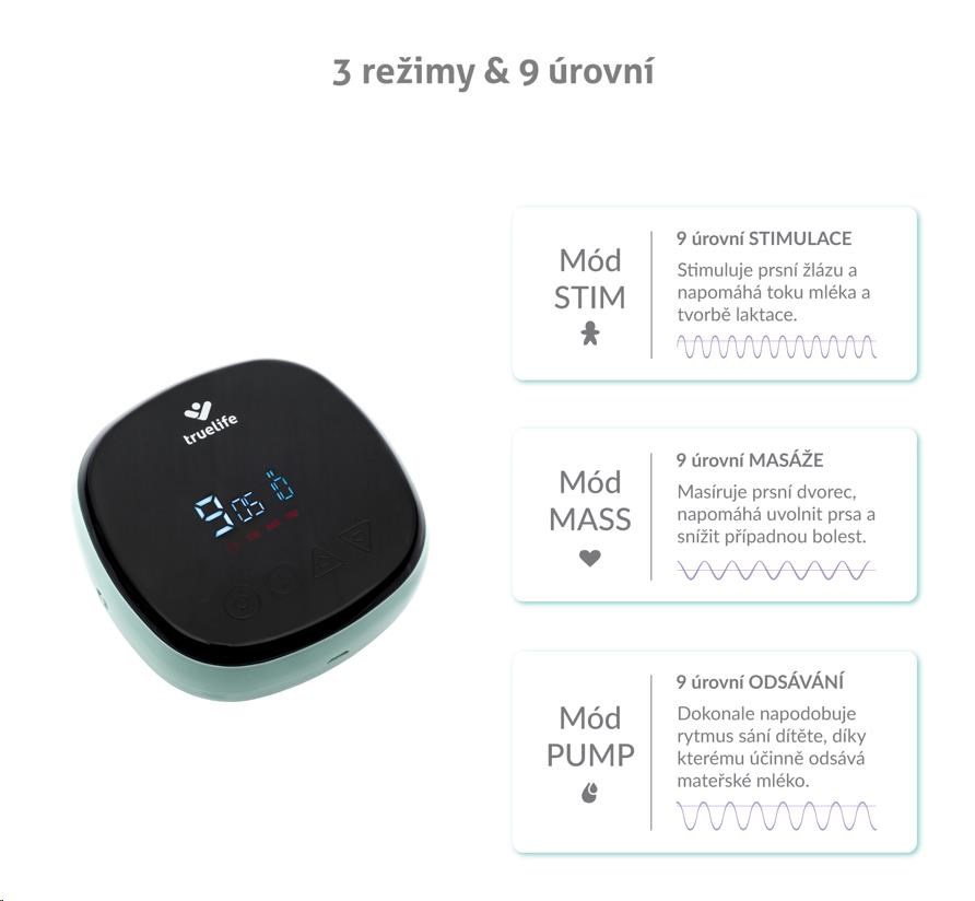 Kromě odsávání můžete zvolit ještě mód stimulace, nebo masáže. U každého módu máte na výběr z devíti úrovní, takže si odsávačku nastavíte přesně tak, jak vám vyhovuje.