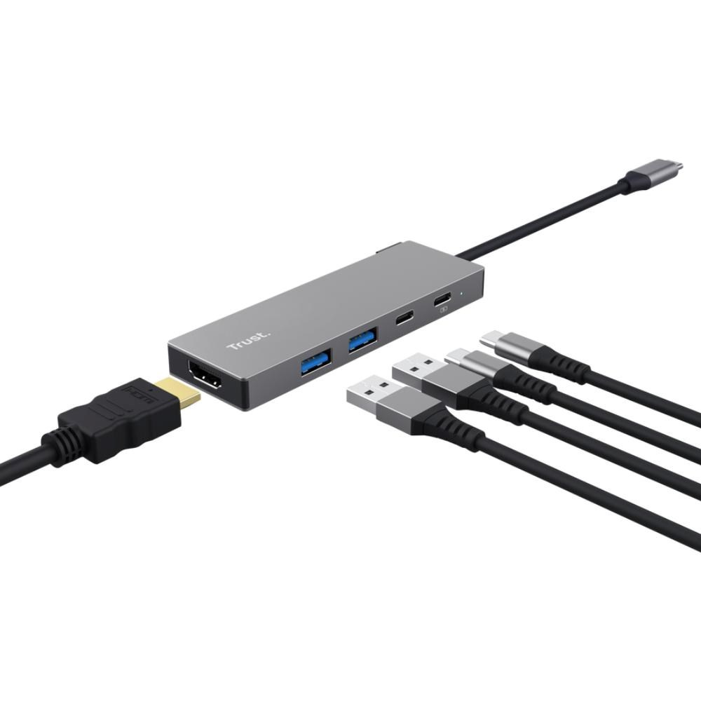 Multiportový adaptér 5v1 pro přidání portů HDMI, USB-C a USB-A k notebooku pomocí jediného připojení USB-C.