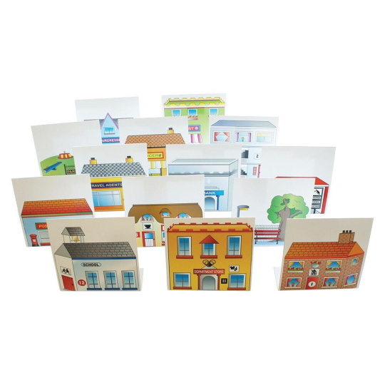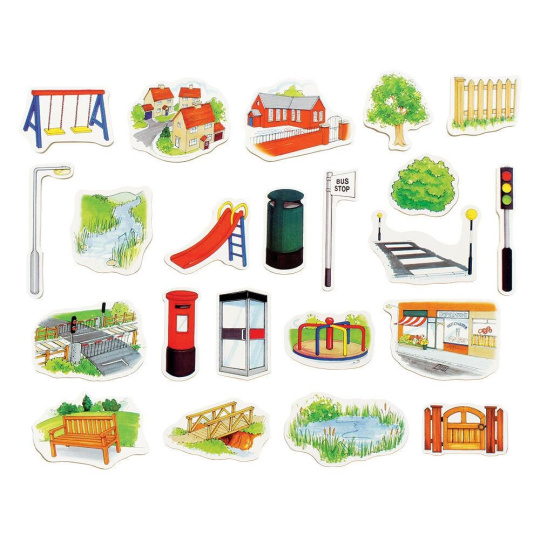 Balíček okolí pro Bee-Bot & Blue-Bot robota. Vybuduj si vlastní město pro Bee-Bota nebo Blue-Bota. Balíček obsahuje podložku, pouliční lampy, stromy, budovy a 22 dřevěných kusů pouličního nábytku.
