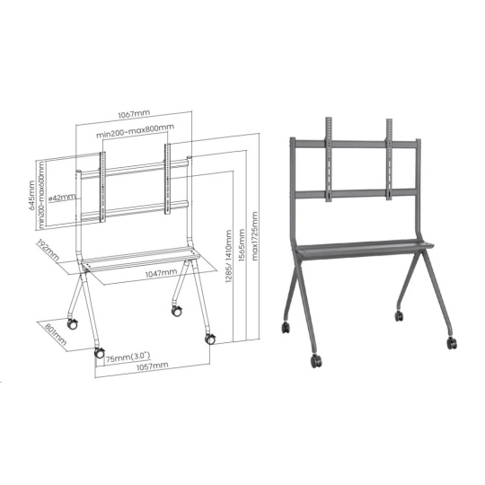 iber Mounts M9C77: Stojan na Tv 50" - 90", nastavení výšky středu Tv od podlahy 1285-1410 mm, polička 1047x192 mm, kolečka 75 mm s aretací, VESA standardy 200x100 až 800x600, nosnost 100 kg Podlahový stojan pro profesionály na jejich prezentace a přednášky, vhodný taktéž do učebny pro zobrazovací zařízení nebo dotykové obrazovky. Ideální pro zavěšení televizoru, monitoru nebo displeje s úhlopříčkou 50" až 90". Stojan Fiber Mounts M9C77podporuje VESA standardy 200x100 až 800x600 a bezpečně unese zařízení s hmotností až 100 kg. Minimální potřebný prostor na podlaze pro umístění stojanu je 1100x850 mm. Výšku obrazovky je možné nastavit od 1285 mm do 1410 mm (od podlahy po střed obrazovky). Stojan je osazen poličkou s rozměry 1047x192 mm. Barevné provedení černé. Záruka 3 roky. Podlahový stojan pro zavěšení televize, pojízdný, nastavení výšky, ideální na přednášky a prezentace Fiber Mounts M9C77 Technické údaje Tv stajanu Fiber Mounts M9C77: nosnost 100 kg pro zavěšení Tv, monitoru, displeje, dotykové obrazovky 50" - 90" podporuje VESA standardy 200x100 až 800x600 nastavitelná výška obrazovky 1285-1410 mm (od podlahy po střed obrazovky) polička 1047x192 mm, nosnost 10 kg pojezdová kolečka o průměru 75 mm s aretací (brzda pro zajištění proti pohybu) potřebný minimální prostor na podlaze 1100x850 mm kvalitní kovová konstrukce barevné provedení černé záruka 3 roky Televizní stojan mobilní s poličkou a nastavením výšky obrazovky Fiber Mounts M9C77 Tv stojan Fiber Mounts M9C77 podporuje VESA standardy pro uchycení: VESA 200x100 VESA 200x200 VESA 300x200 a 200x300 VESA 300x300 VESA 400x200 a 200x400 VESA 400x300 a 300x400 VESA 400x400 VESA 500x200 VESA 500x300 VESA 500x400 VESA 500x500 VESA 600x300 VESA 600x400 VESA 600x500 a 500x600 VESA 600x600 VESA 700x300 VESA 700x400 VESA 700x500 VESA 700x600 VESA 800x400 VESA 800x500 VESA 800x600.