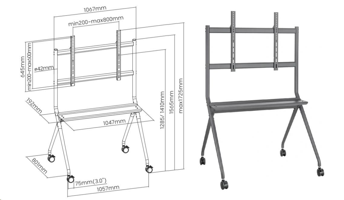 iber Mounts M9C77: Stojan na Tv 50" - 90", nastavení výšky středu Tv od podlahy 1285-1410 mm, polička 1047x192 mm, kolečka 75 mm s aretací, VESA standardy 200x100 až 800x600, nosnost 100 kg Podlahový stojan pro profesionály na jejich prezentace a přednášky, vhodný taktéž do učebny pro zobrazovací zařízení nebo dotykové obrazovky. Ideální pro zavěšení televizoru, monitoru nebo displeje s úhlopříčkou 50" až 90". Stojan Fiber Mounts M9C77podporuje VESA standardy 200x100 až 800x600 a bezpečně unese zařízení s hmotností až 100 kg. Minimální potřebný prostor na podlaze pro umístění stojanu je 1100x850 mm. Výšku obrazovky je možné nastavit od 1285 mm do 1410 mm (od podlahy po střed obrazovky). Stojan je osazen poličkou s rozměry 1047x192 mm. Barevné provedení černé. Záruka 3 roky. Podlahový stojan pro zavěšení televize, pojízdný, nastavení výšky, ideální na přednášky a prezentace Fiber Mounts M9C77 Technické údaje Tv stajanu Fiber Mounts M9C77: nosnost 100 kg pro zavěšení Tv, monitoru, displeje, dotykové obrazovky 50" - 90" podporuje VESA standardy 200x100 až 800x600 nastavitelná výška obrazovky 1285-1410 mm (od podlahy po střed obrazovky) polička 1047x192 mm, nosnost 10 kg pojezdová kolečka o průměru 75 mm s aretací (brzda pro zajištění proti pohybu) potřebný minimální prostor na podlaze 1100x850 mm kvalitní kovová konstrukce barevné provedení černé záruka 3 roky Televizní stojan mobilní s poličkou a nastavením výšky obrazovky Fiber Mounts M9C77 Tv stojan Fiber Mounts M9C77 podporuje VESA standardy pro uchycení: VESA 200x100 VESA 200x200 VESA 300x200 a 200x300 VESA 300x300 VESA 400x200 a 200x400 VESA 400x300 a 300x400 VESA 400x400 VESA 500x200 VESA 500x300 VESA 500x400 VESA 500x500 VESA 600x300 VESA 600x400 VESA 600x500 a 500x600 VESA 600x600 VESA 700x300 VESA 700x400 VESA 700x500 VESA 700x600 VESA 800x400 VESA 800x500 VESA 800x600.