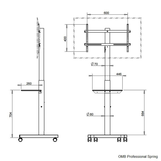 Tv stojan OMB Professional Spring Televizní stojan s plynovou pružinou pro snadné a rychlé nastavení výšky 140-170cm bez nářadí, nosnost 40kg, VESA 100x100 až 600x400, na televizory a monitory 32" až 65" Profesionální stojan robustní, velmi pevné, bezpečné a stabilní konstrukce, který má uvnitř nosníku integrovanou plynovou pružinu pro možnost velmi snadného nastavení výšky obrazovky bez nutnosti použití jakéhokoliv nářadí, navíc neskutečně rychle a pohodlně. Plynová pružina zajistí po stlačení bezpečnostní páčky plynulé vyjetí obrazovky do horní pozice, v případě potřeby snížit výšku stačí zatlačit na obrazovku. Regulovat výšku je možné v rozmezí 140cm až 170cm (výška stojanu po střed obrazovky). Stojan je ideální na televizory a monitory s hmotností do 40kg, které podporují jakýkoliv VESA standard v rozmezí 100x100 až 600x400mm včetně. Doporučená úhlopříčka je 32" až 65", ale je možné použít i větší obrazovky až do úhlopříčky 65". Podstavec stojanu je osazen kvalitními pojezdovými kolečky, které zajišťují vynikající mobilitu. Televizní stojan OMB Professional Spring dodáváme v černém provedení. Televizní stojan s nastavením výšky a kolečky OMB Professional Spring Technické údaje: max. zatížení 40kg podpora VESA standardu 100x100 až 600x400 doporučená úhlopříčka zavěšené obrazovky 32" až 65" nastavitelná výška stojanu v rozmezí 1400 až 1700mm integrovaná plynová pružina pro snadné a rychlé nastavení výšky bez použití nářadí možnost dokoupení police na příslušenství OMB Shelf Handy s rozměry 447x300mm nosnost police na příšlušenství 5kg robustní, velmi pevná konstrukce profesionální kvalita bezpečný, stabilní stojan barevné provedení černé záruka 3 roky Televizní stojan s plynovou pružinou pro snadné a rychlé nastavení výšky v rozmezí 140 až 170cm, nosnost 40kg, VESA standard 100x100 až 600x400 - OMB Professional Spring Televizní stojan OMB Professional Spring podporuje VESA standardy: VESA 100x100 VESA 200x100 VESA 200x200 VESA 300x200 VESA 300x300 VESA 400x200 VESA 400x300 VESA 400x400 VESA 600x400 Na Tv stojan je možné zavěsit všechny typy televizorů a monitorů, které mají hmotnost do 40kg a podporují kterýkoliv z výše uvedených VESA standardů. Velikost televizoru není podstatná, pouze doporučujeme minimální úhlopříčku 32", ideálně 37" a větší. Na televizní stojan OMB Professional Spring je možné dokoupit polici na příslušenství OMB Shelf Handy s nosností 5kg: Police na příslušenství ke stojanu OMB Professional Spring - OMB Shelf Spring Díky vynikajícímu řešení nastavitelné výšky pomocí plynové pružiny zvládne nastavování výšky bez jakéhokoliv nářadí a námahy kdokoliv. Stojan je ideální pro využití na prezentacích, výstavách, přednáškách, konferencích, čekárnách a kdekoliv pro komerční i nekomerční účely..