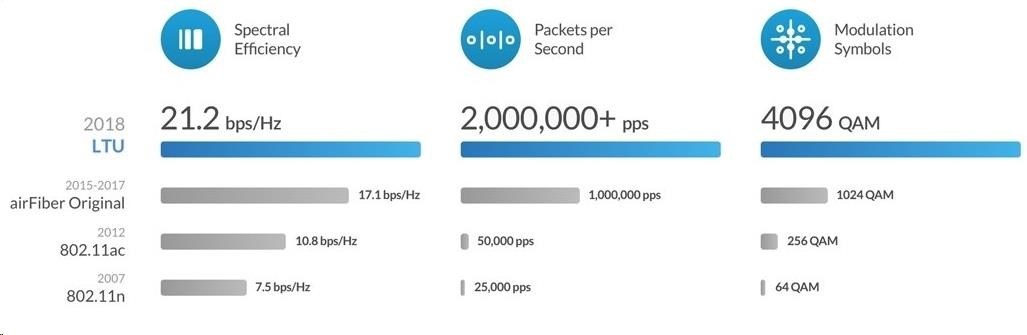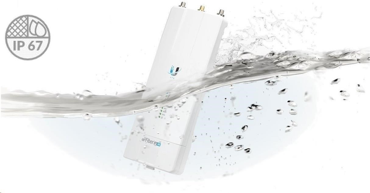 AF-5XHD je v současné době nejvýkonnějším a nejlépe vybaveným airFiber zařízením od Ubiquiti Networks. Revoluční procesor s označením airFiber LTU IC doáže zpracovat přes 2 miliony+ paketů za sekundu při 1Gbps+ (TDD) reálného datového toku v bezlicenčním pásmu 5GHz při 1024QAM (v plánovaném firmwaru je počítáno s podporou až 4096QAM s ještě vyšší propustnosí). Mezi další klíčové vlastnosti můžeme zařadit 2x Gigabit LAN, kdy jeden port je určen pouze pro management, časová synchronizace přes GPS, dedikovaný spektrální analyzér, vysoká odolnost proti vodě (IP67) a nastavitelná šířka kanálu 10/20/30/40/50/60/80 a 100MHz. AirFiber 5XHD je díky velmi dobré konstrukci a přiloženému gumovému adaptéru odolný vůči vodě a je ideální pro jakékoli povětrnostní podmínky.