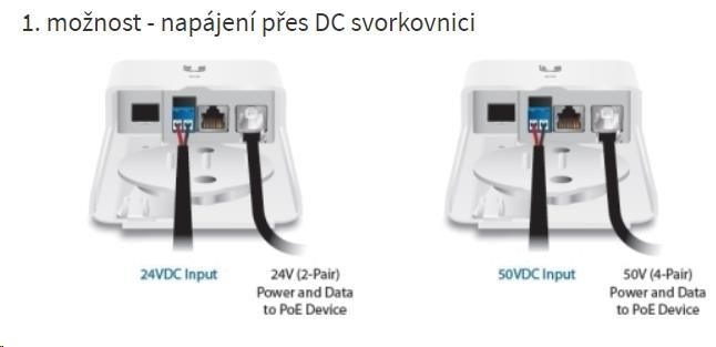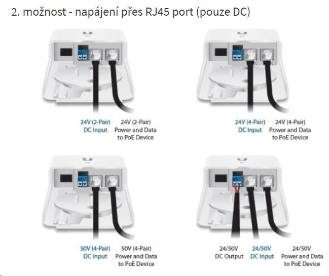 FiberPOE obsahuje 2 ethernetové porty, 1 SFP slot a DC svorkovnici. Pro napájení převodníku jsou celkem 3 možnosti: první je DC svorkovnice, druhá a třetí je přes RJ45 porty. Převodník lze tedy napájet z obou ethernetových portů, nicméně data přenáší pouze port označený jako POE. Všechny 3 možnosti pracují v rozsahu 16 až 50V DC.