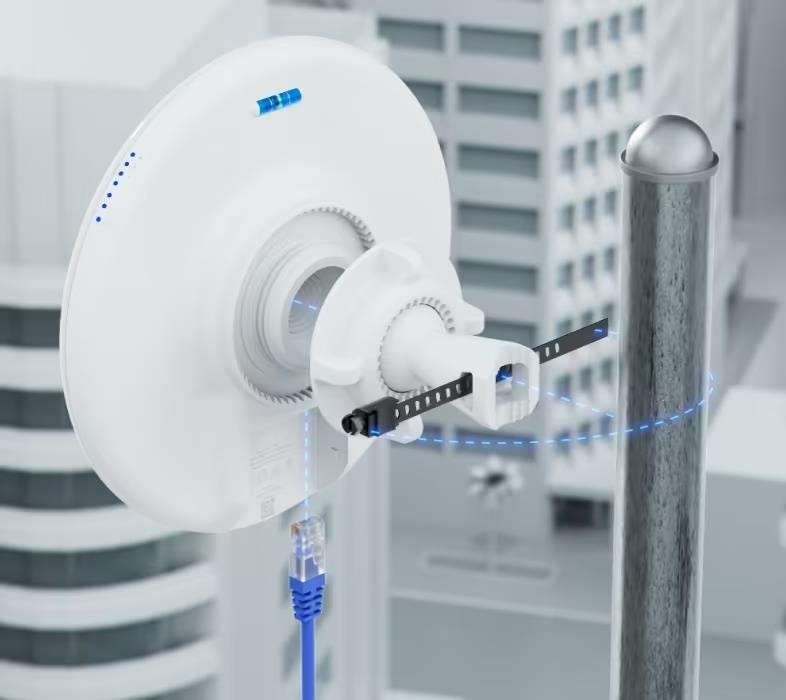 5 GHz wireless bridge with PoE output that connects at 5+ km distances or seamlessly uplinks to UniFi WiFi. Link at 5+ km distances with a point-to-point connection to another Device Bridge Pro, or uplink seamlessly with UniFi WiFi Auto-Link (2) GbE ports with (1) PoE output for PoE devices Powered using PoE/PoE+* Pole mounting Weatherproof (outdoor exposed) Sold as a single unit Note. Cannot be set up standalone and must be managed by a UniFi Console, Official UniFi Hosting, or a Self-Hosted UniFi Network Server. *PoE adapter included. PoE+ input required for PoE passthrough..