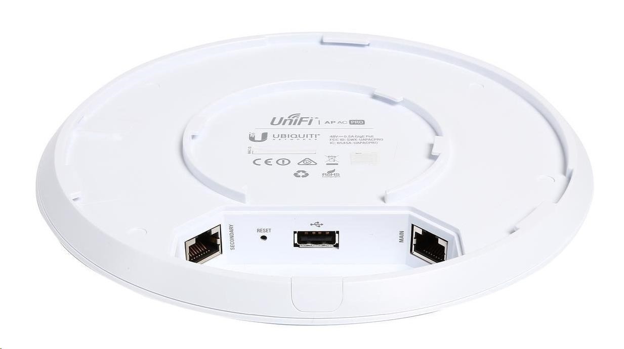 UAP-AC-PRO je určeno do vnitřních i venkovních prostor, nabízí rychlosti 450Mbps v 2.4GHz (3x3MIMO) + 1300Mbps v 5GHz(3x3MIMO). Napájení je realizováno aktivním PoE dle 802.3af/at. K dispozici jsou dva gigabitové ethernet porty.