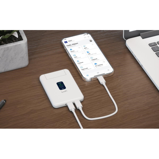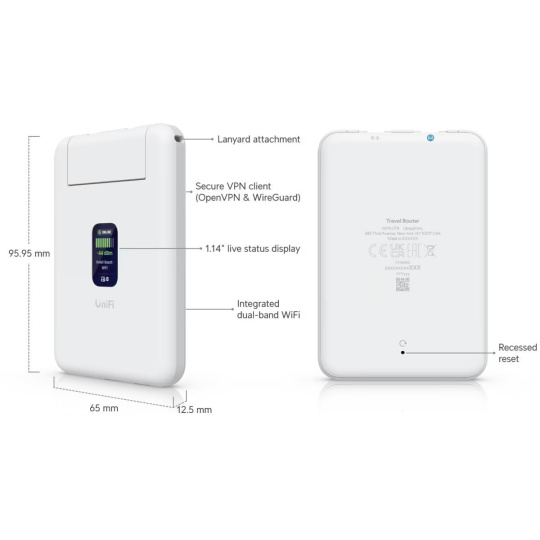 Popis produktu Ubiquiti UniFi Travel Router je ultra-kompaktní cestovní dual-band Wi-Fi 5 router pracující současně v pásmech 2,4GHz a 5GHz pro dosažení maximální propustnosti až 1,17Gbps, který je dále vybaven (2) 1Gbit porty a intuitivním displejem. Router může sdílet mobilní data z telefonu nebo proměnit veřejnou Wi-Fi síť na soukromou. Díky funkci Teleport lze snadno vytvořit zabezpečený VPN tunel zpět do vaší UniFi sítě odkudkoliv. Klíčové vlastnosti • (2) 1Gbit porty (1x LAN, 1x LAN/WAN) a dual-band Wi-Fi 5 • Celková propustnost až 1,17Gbps - 300Mbps na 2,4GHz (2x2) a 867Mbps na 5GHz (2x2) • USB tethering - sdílení mobilních dat z telefonu přes USB-C • Teleport - WireGuard VPN připojení k UniFi gateway bez potřeby konfigurace • Napájení přes dedikovaný USB-C port Zařízení je spravováno lokálně pomocí webového rozhraní a výrobce nabízí také vzdálenou správu pomocí portálu UniFi Mobility Manager, která je ale výrobcem zpoplatněna. Obsah balení • Zařízení • USB-C - USB-C kabel Technické parametry Bezdrátové vlastnosti Bezdrátové frekvence:2.4 + 5 GHz (dual band), Bluetooth WiFi standardy:802.11n, 802.11a, 802.11ac, 802.11b/g Přenosová rychlost - 5GHz [Mb/s]:866 Přenosová rychlost - 2.4GHz [Mb/s]:300 Vysílací výkon 2.4GHz [dBm]:13 Vysílací výkon 5GHz [dBm]:13 2.4GHz MIMO:2 x 2 5GHz MIMO:2 x 2 Typ antény:Vestavěná Počet vestavěných antén:2 Konektory a rozhraní Počet portů USB-C:2 Rychlost LAN:(1) 10/100/1000Mbps + (1) 10/100/1000Mbps LAN/WAN Gigabit LAN:Ano USB:Ano Ostatní:LCD displej, Bluetooth Napájení Typ napájení:USB-C Max. spotřeba energie [W]:5 Fyzické charakteristiky Použití:Vnitřní Tlačítka:Reset Provozní teplota [°C]:-10 až 40 Hmotnost [g]:89 Šířka [mm]:65 Výška [mm]:96 Hloubka [mm]:13 Software Podporované VPN:OpenVPN, WireGuard Operační mód:AP Router.
