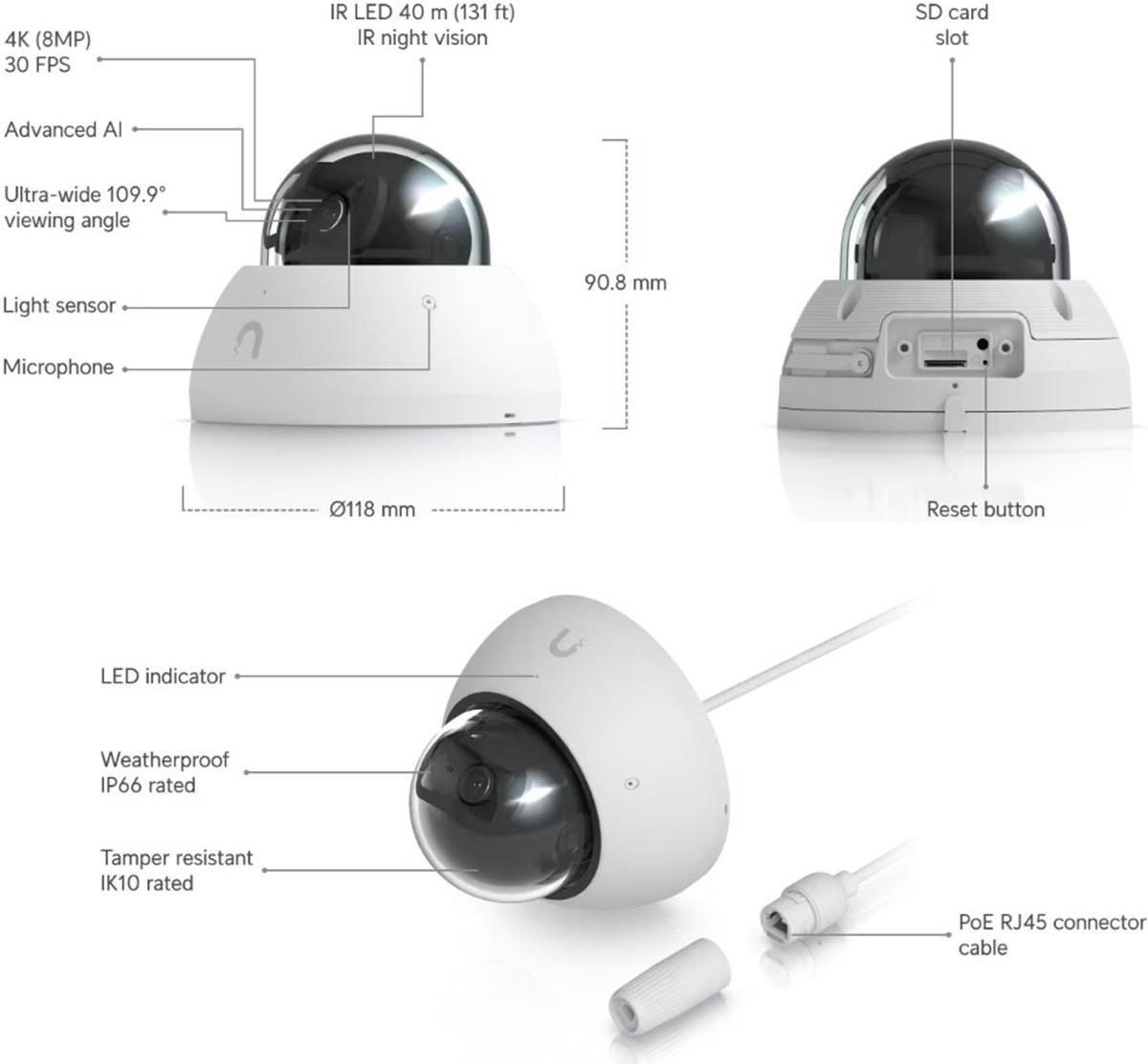 Popis produktu Venkovní 4K PoE Dome kamera s vylepšenou AI pro rozpoznávání osob a registračních značek, dlouhým dosahem nočního IR vidění a ochranou vůči nepříznivému počasí. Kamera snímá 8 Mpx video (3840 x 2160) při 30 snímcích za sekundu s fixním 2.8mm objektivem Klíčové vlastnosti 4K (8 MP) rozlišení Úhel záběru - 109.9° horizontálně, 134.1° diagonálně, 56.7° vertikálně Vestavěné IR LED diody a automatický IR cut filtr pro lepší noční vidění (40m) Voděodolnost IP66 + odolnost IK10 (antivandal) Mikrofon (lze vypnout) Antivandal ochrana IK10 Micro SD (minimálně 64 GB) Napájení přes PoE (42.5-57V DC) Obsah balení Zařízení Montážní příslušenství Technické parametry Kamera Typ objektivu:Fixní Objektiv [mm]:2,8 (fixní) Přísvit:IR Dosah přísvitu [m]:40 Pozorovací úhel [°]:110 Režim den/noc:IR cut filtr Obrazový senzor ["]:1/1.8 Bezdrátové vlastnosti Typ antény:Fixní Obraz Rozlišení:8MP Max. rozlišení [pixely]:3840 x 2160 (4K UHD) Konektory a rozhraní Slot na paměťové karty:microSD Audio:Mikrofon Napájení Napájení přes PoE:42 .. 57V DC Typ napájení:PoE Max. spotřeba energie [W]:10 Fyzické charakteristiky Stupeň krytí:IP66 Použití:Venkovní Antivandal (ochrana proti nárazu):IK10 Tlačítka:Reset Provozní teplota [°C]:-30 až 50 Hmotnost [g]:700 Šířka [mm]:118 Výška [mm]:91 Hloubka [mm]:118 Barva:Bílá Obecné Kamerová řada:UniFi Protect Technologie a vymoženosti:Face capture, Čtení SPZ Software Výchozí IP adresa:192.168.1.20, Dynamická z DHCP Výchozí jméno a heslo:ubnt / ubnt.