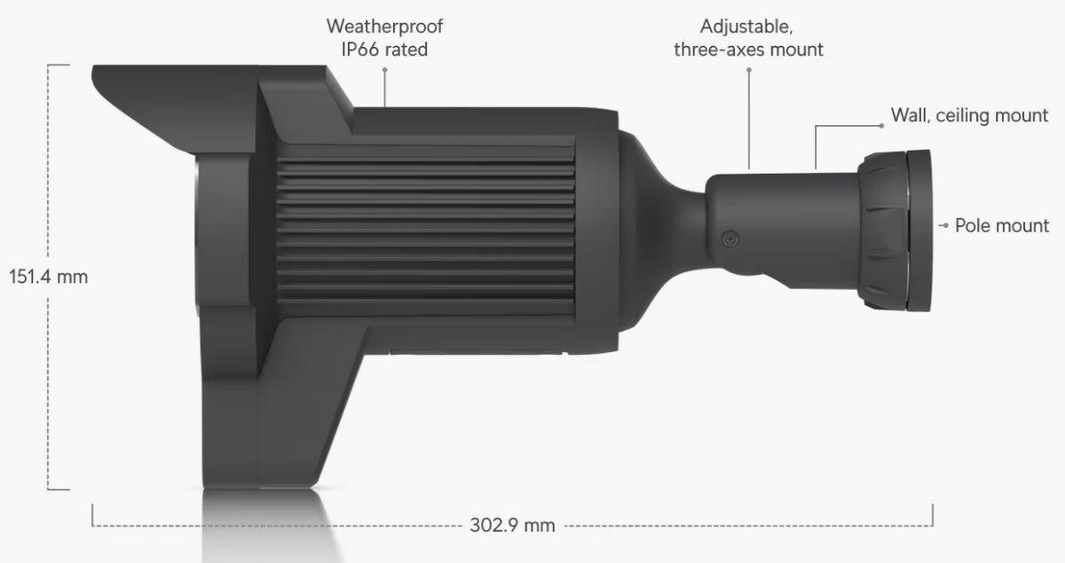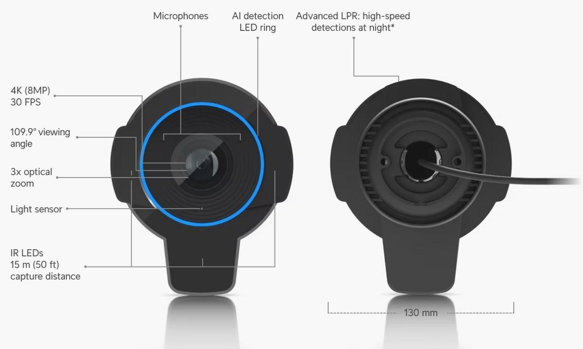 Popis produktu Nová AI kamera od Ubiquiti specializovaná pro rozpoznávání SPZ vozidel pohybujících se rychlostí až 90 km/h. Kamera má 1/1,8'' snímač s rozlišením 8MP (4K 3840 x 2160), 3x optickým zoomem a IR přísvitem do vzdálenosti 15m. Ohnisková vzdálenost objektivu 4,1-12,3mm zajišťuje pozorovací úhel kamery 35°-109,9°. Kamera je vybavena 1x gigabitovým portem, který slouží zároveň k napájení kamery pomocí PoE+ 802.3at. Maximální spotřeba kamery je 25,5W. Kryt kamery je v odolném provedení IP66 s odolností proti nárazu IK04. Pro nahrávání audio stopy je zde integrovaný mikrofon a díky AI disponuje kamera pokročilými funkcemi, detekcemi a rozpoznávání objektů. Klíčové vlastnosti • 8MP snímač 1/1,8'' s rozlišením 4K 3840x2160 při 30fps • 3x optický zoom • IR přísvit až 15m • LPR - rozpoznávání SPZ vozidel až do ryhclosti 90km/h • krytí IP66 a odolnost IK04 Obsah balení • Kamera • Držák • Voděodolná průchodka • Kovová spona • Šrouby a hmoždinky Technické parametry Kamera Typ objektivu:Varifokální - motorický Objektiv [mm]:4,1 až 12,3 (nastavitelný) Přísvit:IR Dosah přísvitu [m]:15 Pozorovací úhel [°]:35 až 110 Režim den/noc:IR cut filtr Obrazový senzor ["]:1/1.8 Obraz Rozlišení:8MP Max. rozlišení [pixely]:3840 x 2160 (4K UHD) Konektory a rozhraní Slot na paměťové karty:Ano Audio:Mikrofon Rychlost LAN:(1) 10/100/1000Mbps Napájení Napájení přes PoE:802.3at Typ napájení:PoE Max. spotřeba energie [W]:25,5 Fyzické charakteristiky Stupeň krytí:IP66 Použití:Venkovní Antivandal (ochrana proti nárazu):IK4 Tlačítka:Reset Provozní teplota [°C]:-20 až 50 Hmotnost [g]:1500 Šířka [mm]:130 Výška [mm]:151 Hloubka [mm]:303 Barva:Černá Obecné Technologie a vymoženosti:Čtení SPZ.