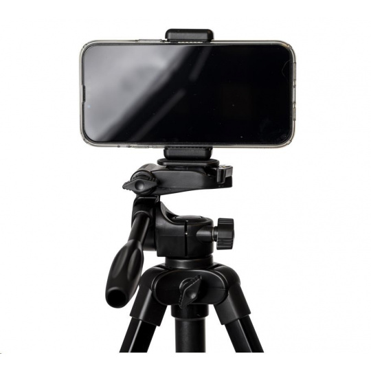 A lightweight aluminium tripod with a three way pan/tilt head and smartphone holder. It can reach a maximum height of 123cm, and can hold up to 2kg. This tripod is perfect for you who use a smaller camera or smartphone