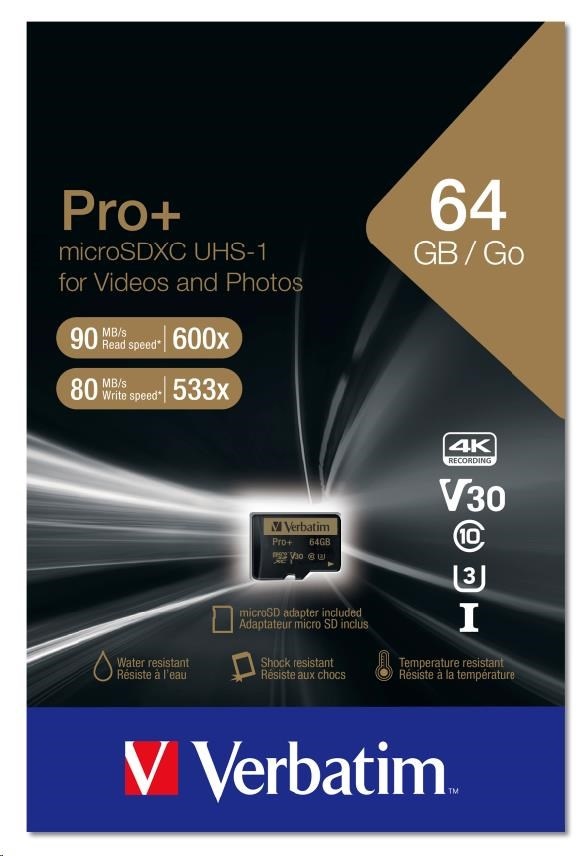 Verbatim Pro+ microSD memory Cards are water resistant & shock resistant.