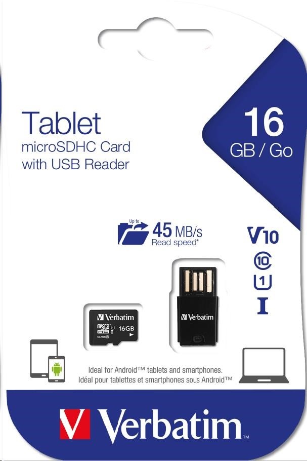 VERBATIM Tablet microSDHC C10/U1 with USB reader 16GB (R:45MB/s, W:10MB/s)