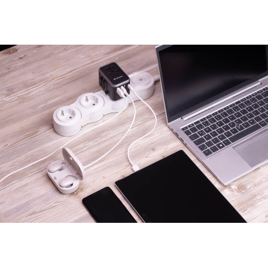 | Specifications | World-to-World adapter (suitable for more than 180 countries) Plug formats: EU, UK, USA/Japan, AUS 1 x USB-C Power Delivery 61W & Quick Charge 3.0 output: 18W 1 x USB-C output: max. 12W 3 x USB-A output: max. 12W Charging of 6 devices simultaneously Flame resistant polycarbonate material Certified fuse + spare fuse Safety shutter for child protection (can only be opened with force of more than 75N (7.5Kg) per hole) Status LED indicator AC Input: 100V-250V, 50/60Hz Rating: 100-250Vac 10A Max, 2500W Max USB-C1 PD/QC: 5.0V 3.0A 15.0W, 9.0V 3.0A 27.0W, 12.0V 3.0A 36.0W, 15.0V 3.0A 45.0W, 20.3V 3.0A 61.0W USB-C2: 5.0V 2.4A 12.0W USB-A1/2/3: 5.0V 2.4A 12.0W Fuse: BS1362 compliant Material: Fireproof polycarbonate Dimensions: 75mm x 50mm x 54mm Weight: 180g Operating Temperature: 0 - 35°C |