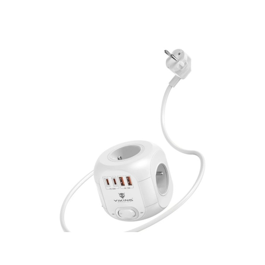 Viking AC CUBE PD30 kombinuje čtyři USB porty (2× USB-C, 2× USB-A), čtyři síťové zásuvky a 1,8m prodlužovací kabel v jednom elegantním a prostorově úsporném zařízení. Umožňuje současně napájet až osm spotřebičů nebo elektroniky, aniž by zbytečně zabíral místo na pracovním stole.