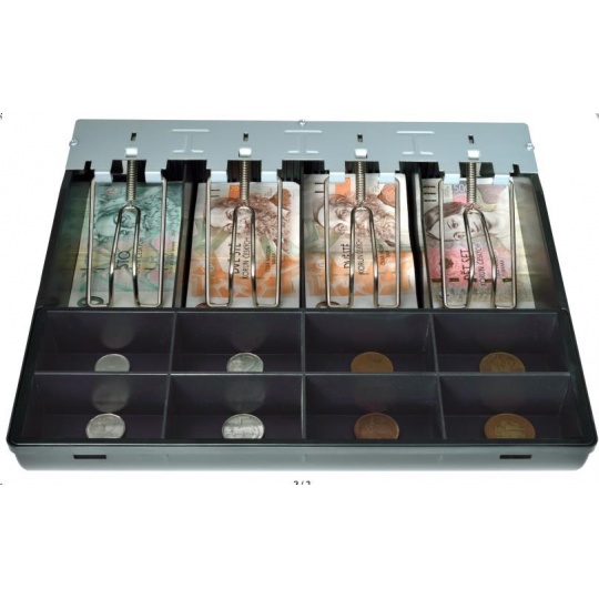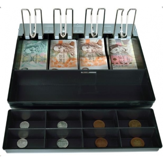 •Přihrádky: 8 × pro mince 4 × pro bankovky - vzhledem k velikosti pořadače se bankovky větší velikosti (vyšší hodnoty od 1000 Kč) umísťují pod mincovník