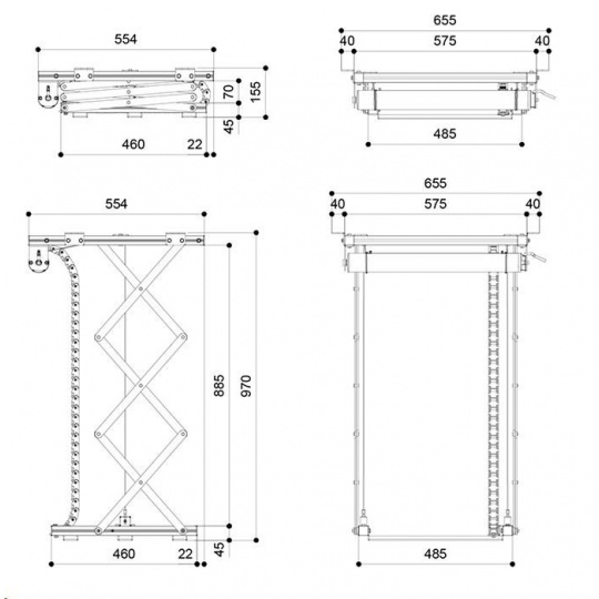 - Rozměry uzavřeného výtahu 575 x 155 x 554 mm (š x v x h)