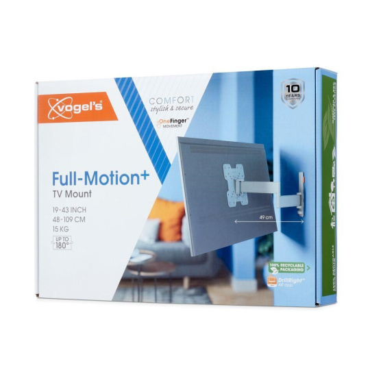 TVM 3243 je stylový nástěnný TV držák řady COMFORT Full-Motion+ a volíte s ním bezpečnost, design a optimální pohodlí při sledování. Držák je velmi robustní a vydrží intenzivní používání. Protože se může otáčet až o 180°, můžete si sledování TV vychutnat z jakéhokoli úhlu v místnosti. Naklápění je možné až do úhlu 20° (10° nahoru a dolů). TVM 3243 je vhodný pro televizory s úhlopříčkou od 19 do 43 palců a hmotností do 15 kg.