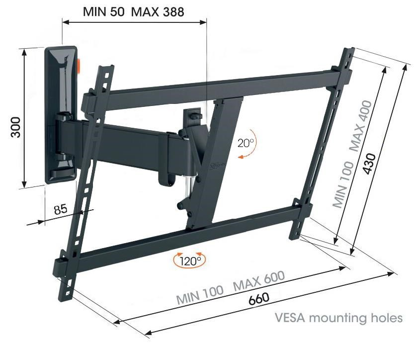 Chcete si užívat svůj velký plochý televizor bez jakýchkoli starostí. S držákem TVM 3623 řady COMFORT Full-Motion TV to dokážete. Váš televizor bude na stěně připevněn stylově a bezpečně. Nástěnný držák je speciálně navržen pro intenzivní používání s ohledem na rodiny s dětmi. Nastavení dokonalého pozorovacího úhlu? Žádný problém. Televizor můžete natočit až o 120° (záleží na šířce TV) a naklonit až o 20°. Nástěnný držák je vhodný pro televizory s úhlopříčkou 40 až 77 palců a hmotností do 35 kg.