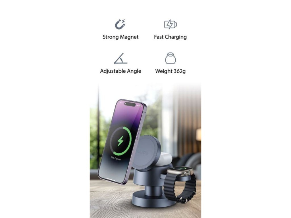 - Bezdrátové nabíjení 3 v 1: pro telefon, hodinky i sluchátka