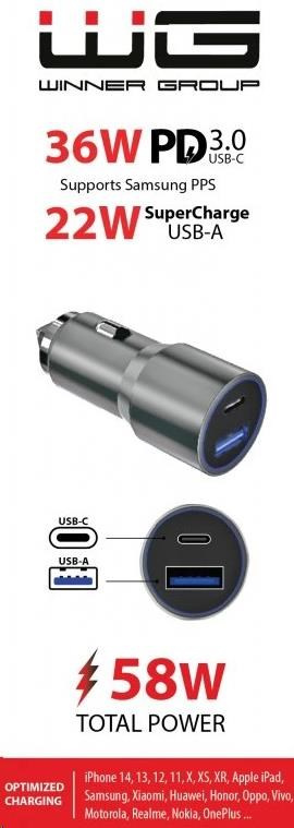 WG - Nabíječka do auta 2x USB 58,5W , 1x USB-C PD 36W + 1x USB-A 22.5W, stříbrná