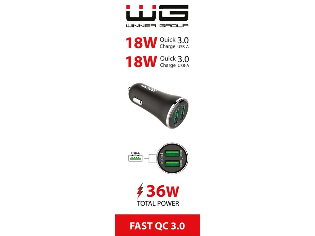WG - Nabíječka do auta 2x USB-A 36W, QC 3.0 + QC 3.0, černá