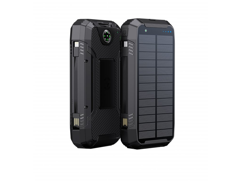 • Solární nabíjení: Solární panel umožňuje dobíjení powerbanky pomocí sluneční energie, ideální pro outdoorové aktivity nebo nouzové situace.