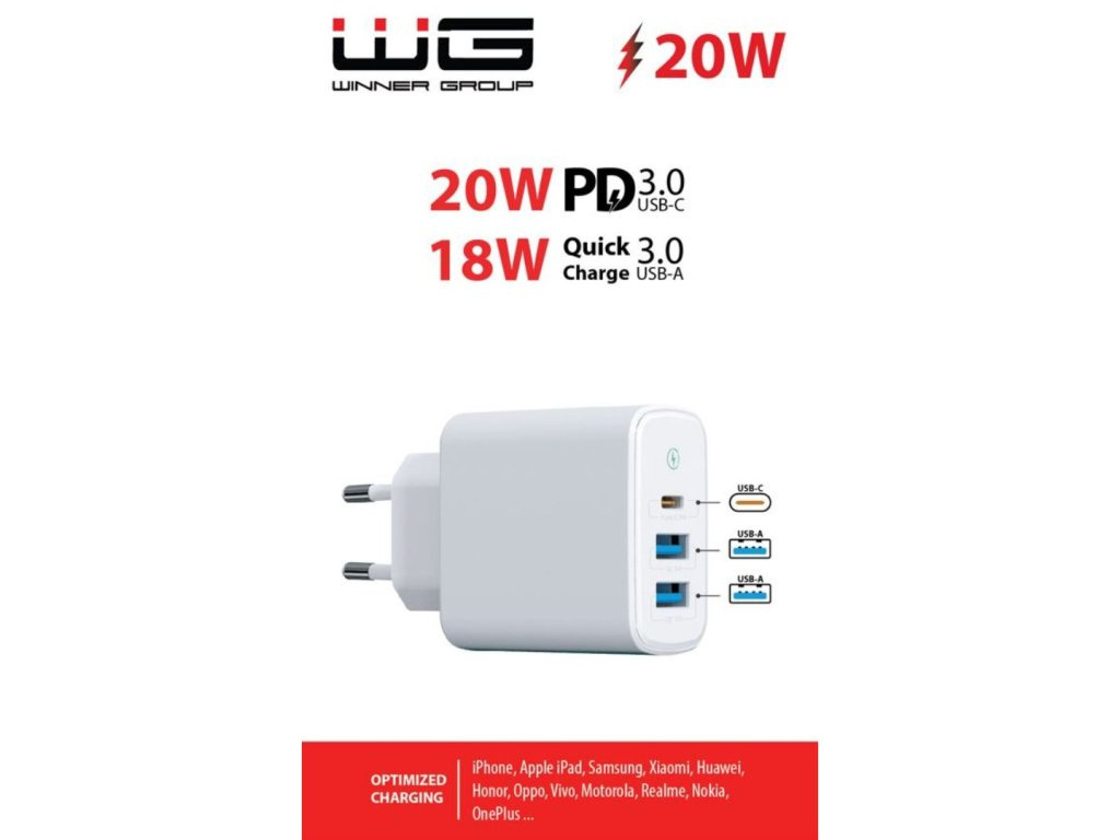 WG - Síťová nabíječka 3x USB, 1x USB-A QC 3.0 + 1x USB-A QC 3.0 + 1x USB-C PD 3.0, bílá