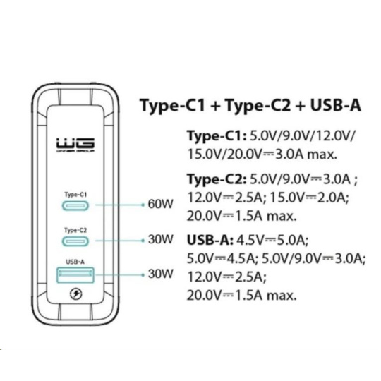 - USB-C1/C2 +USB-A: 5V/9V/12V/15V?3A, 20V?4.35A max (87W+30W)