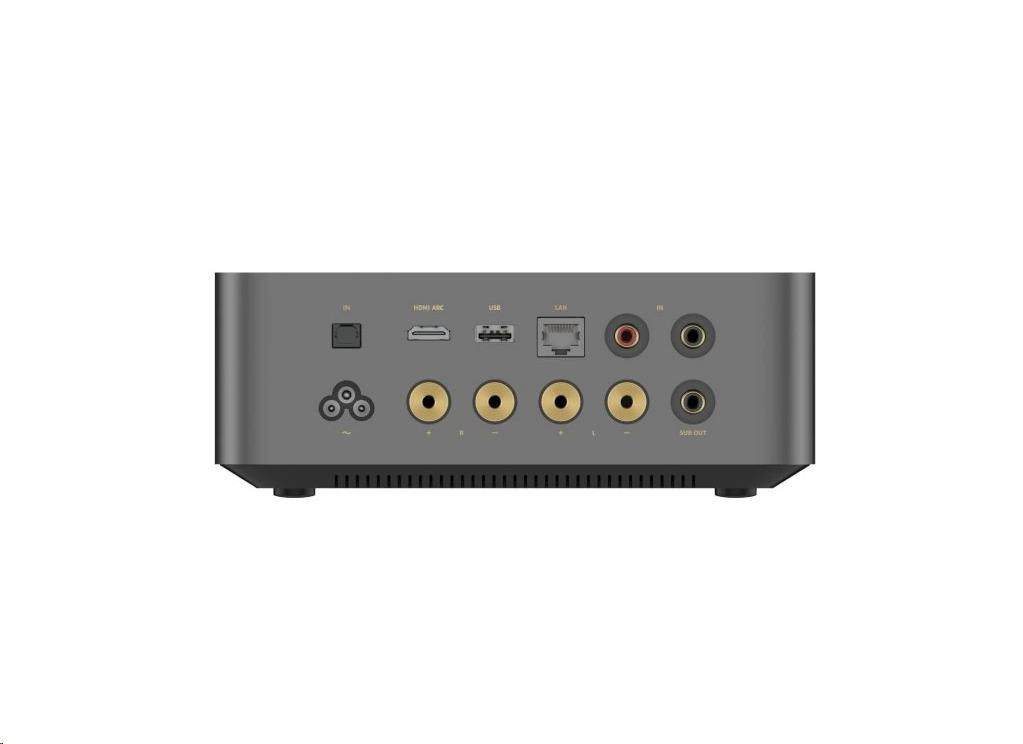 Vstupy: 1x RCA, 1x optický (PCM 192kHz/24-bit), HDMI ARC (PCM/Dolby Digiital), USB A (24-bit/192kHz), Ethernet (100Mbps)