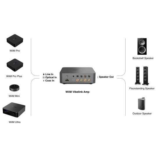 Vibelink Amp je HiFi zesilovač od WiiM navržený pro použití s moderními firemními streamovacími zařízeními, podobně jako jsou WiiM Mini, Pro, Pro Plus či Ultra, ale tím že je vybaven pečlivě vybranými komponenty vysoké kvality z něj dělá ideálního společníka také pro vaše audio komponenty vysoké kvality (CD / Streamery, BD/DVD přehrávače, Gramofony s apod.)