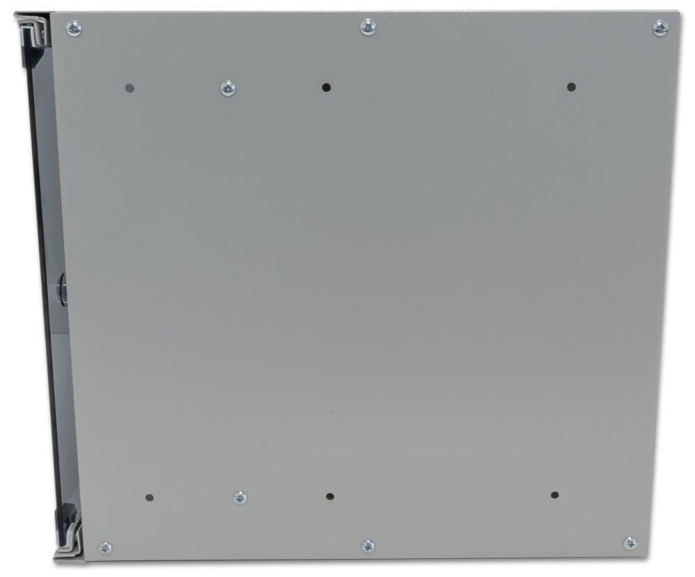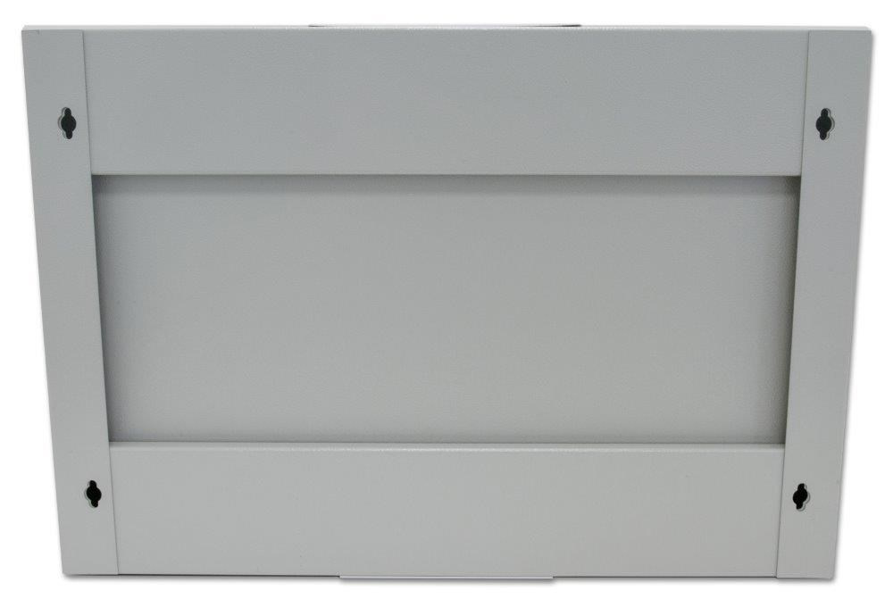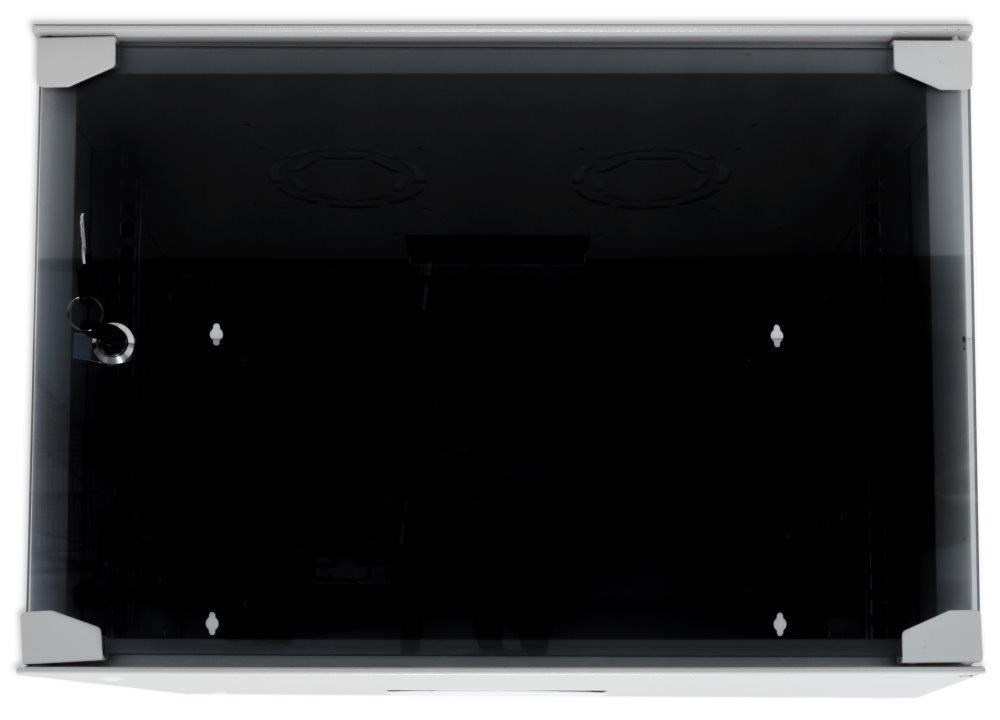 Univerzální jednodílný rozvaděč určený pro montáž na zeď (snadné připevnění - na hmoždinky). Vyroben je z válcované oceli, nosné části jsou z oceli tloušťky 1,5 mm (ostatní z 1,2 mm ocelového plechu). Konstrukce dovoluje statickou zátěž 35 kg. Přední dveře jsou skleněné, uzamykatelné. Boční panely nejsou odnímatelné. Dodává se s montážní sadou. Provedení: dveře - bezpečnostní sklo, zaměnitelný směr otevírání zádní kryt - plný boční kryt - plný horní kryt - perforovaný, s pozicemi pro dva ventilátory