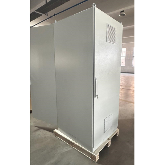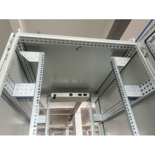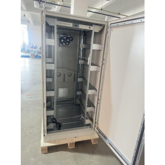 Rozvaděč pro instalaci datových a telekomunikačních zařízení, ventilace s termostatem, podstavec, šedý.