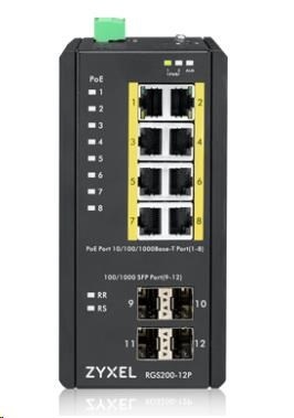 Zyxel RGS200-12P 12-port Gigabit WebManaged PoE switch, 8x GbE + 4x SFP, PoE budget 240W, DIN rail/Wall mount, IP30